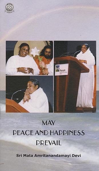 May Peace and Happiness Prevail is a keynote address given by Sri Mata Amritanandamayi Devi, affectionately known as Amma, during the Closing Plenary Session of The Parliament of Worlds Religions in Barcelona, Spain, on July 13th, 2004. In her speech Amma touches on all the major problems facing today's world. In her clear, simple and profound way, Amma emphasizes how spirituality alone can help us to rise above the barriers created by religion, language, culture and nationality.