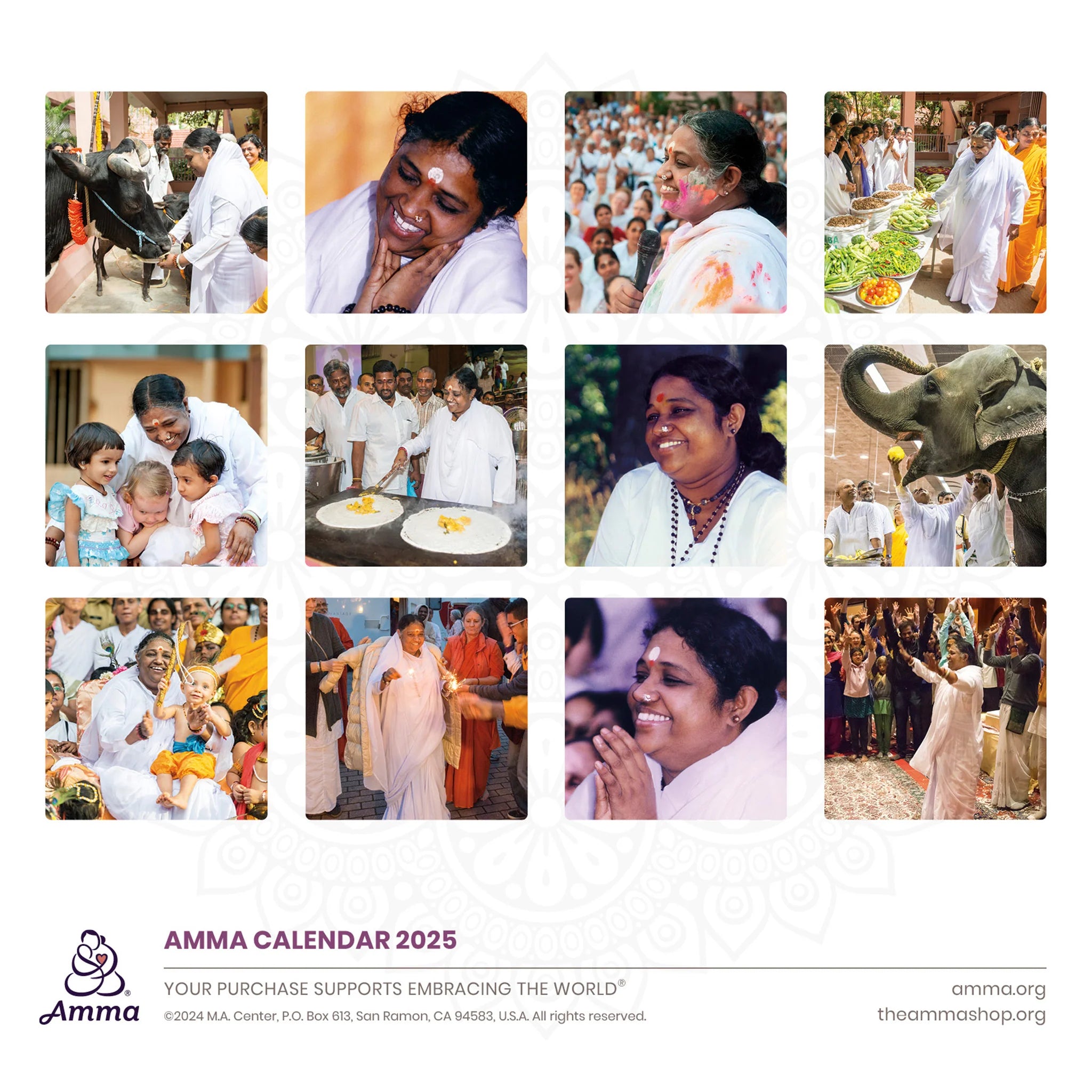 Greet every day in 2025 with a 12x12 monthly calendar filled with stunning photographs of Amma. This beautifully designed calendar includes prominent Hindu and international religious holidays. The calendar starts with January 2025 and runs through December 2025 with its month and day headings in English. An artistic layout enhances the spectacular digital photography, perfectly showcasing the precious moments captured by the photos.