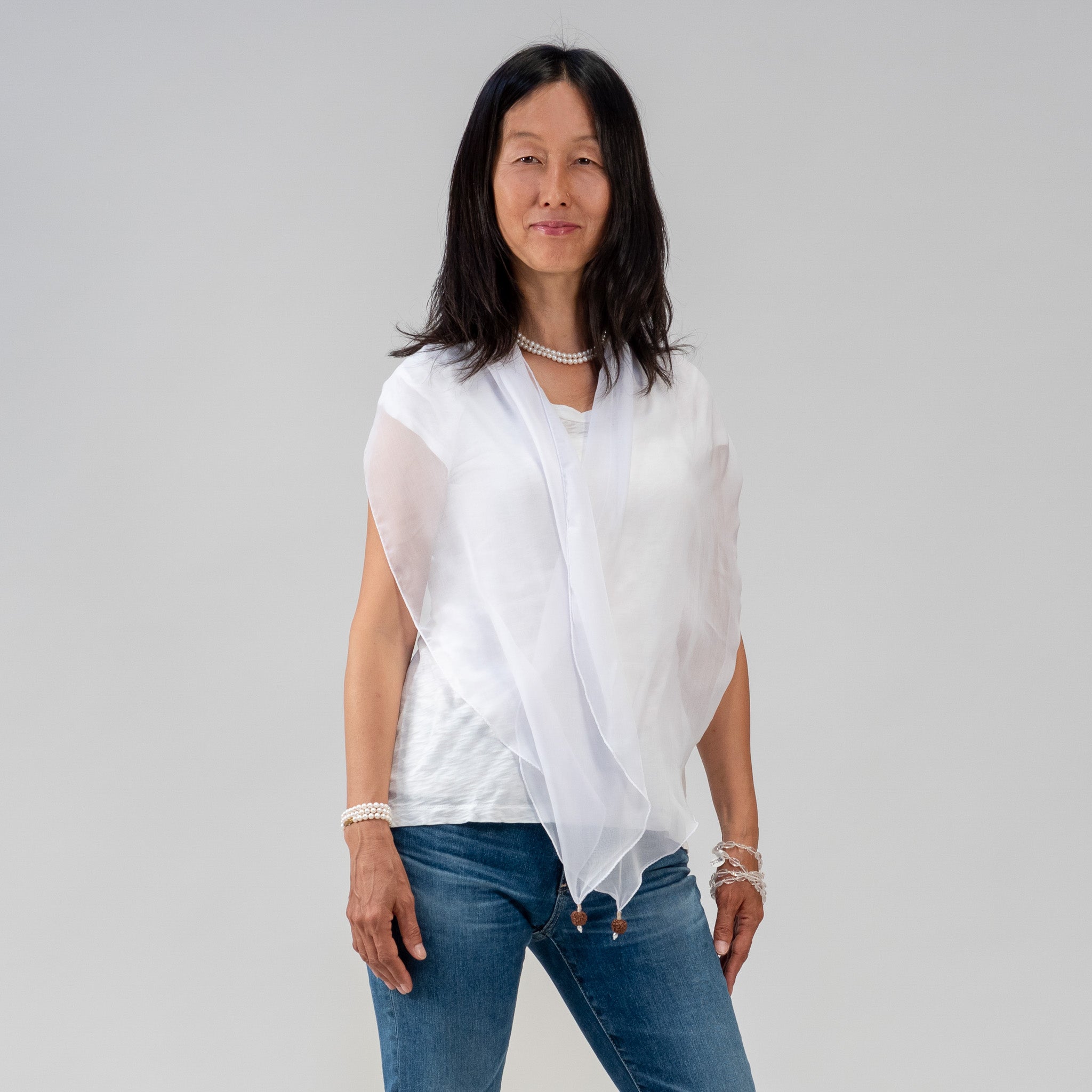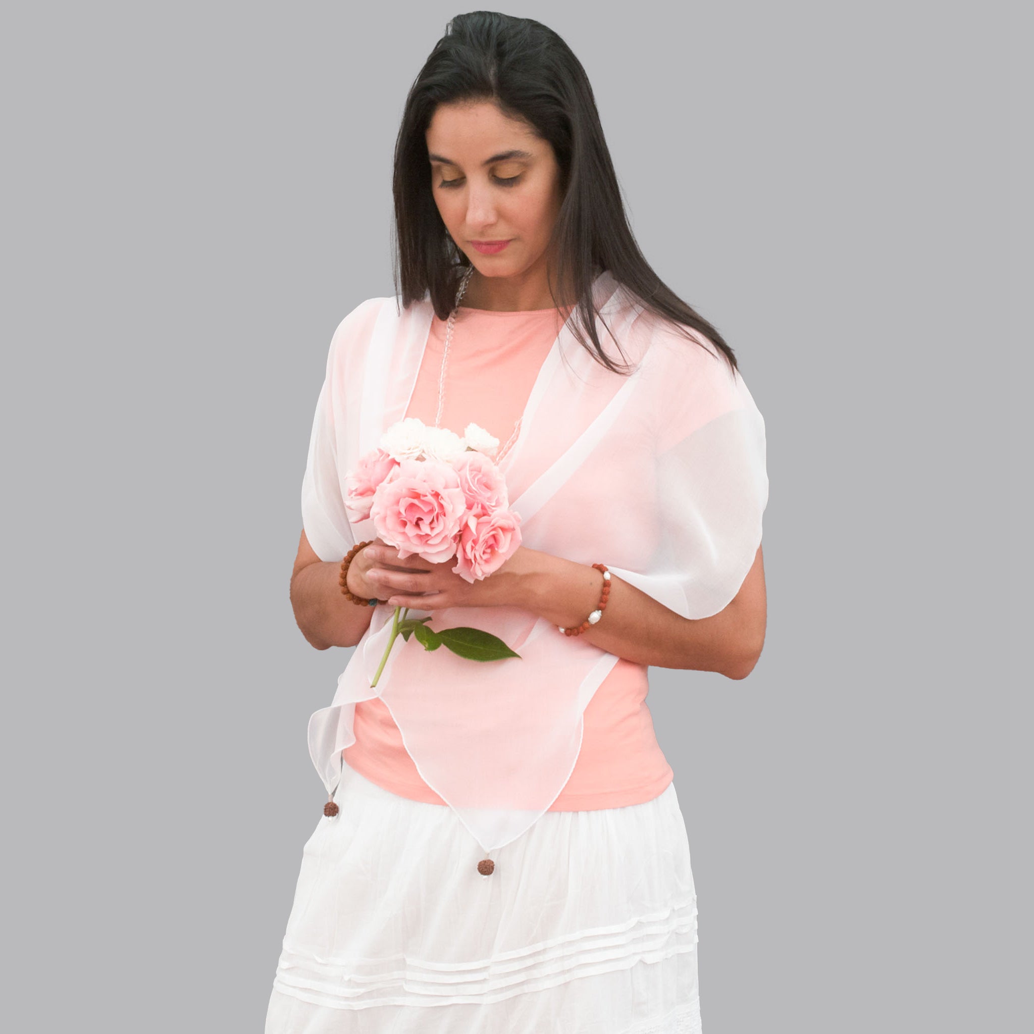 scarf is trimmed with holy rudraksha beads grown