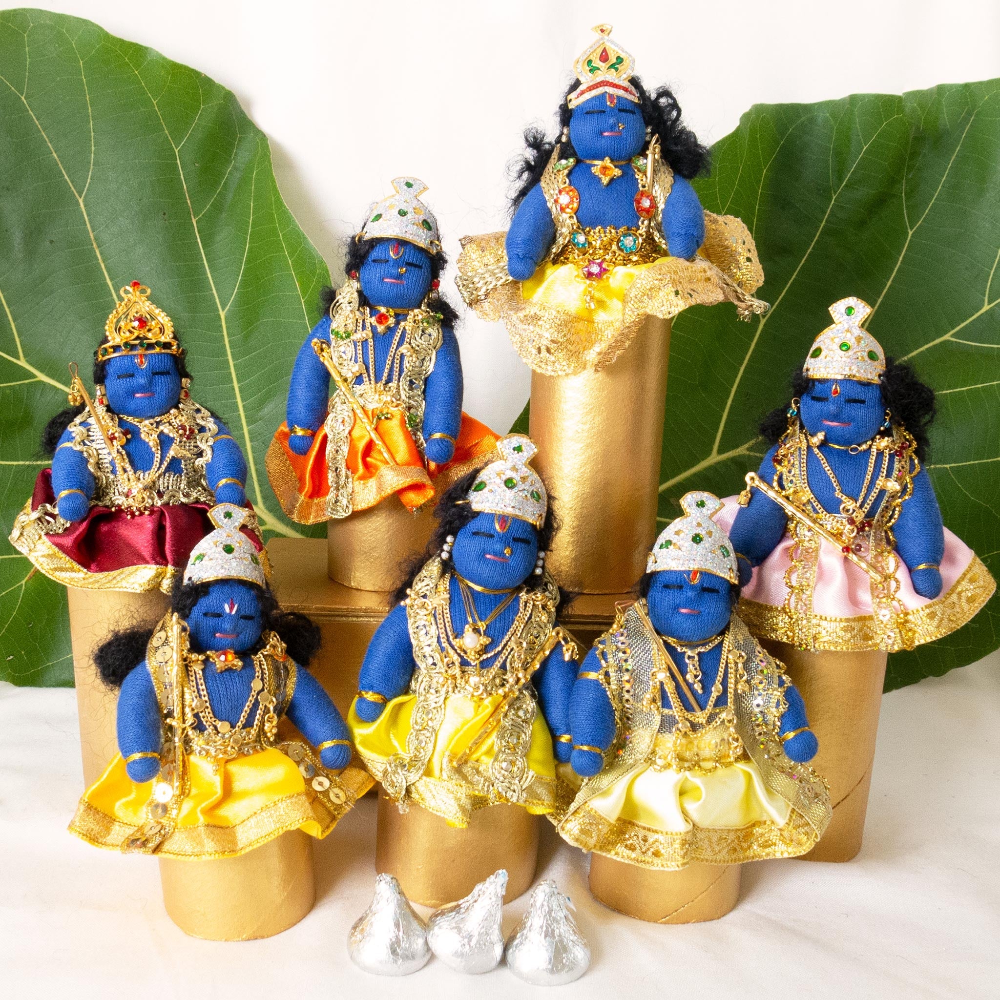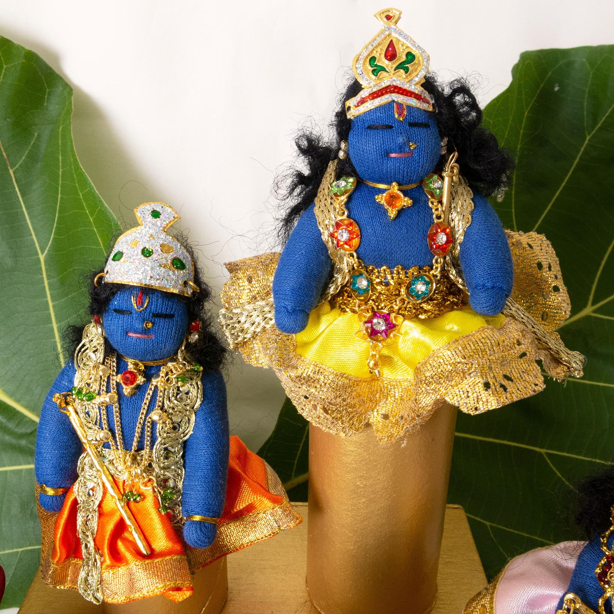 Our Krishna doll is holding a flute and his crown has a real peacock feather attached to it.