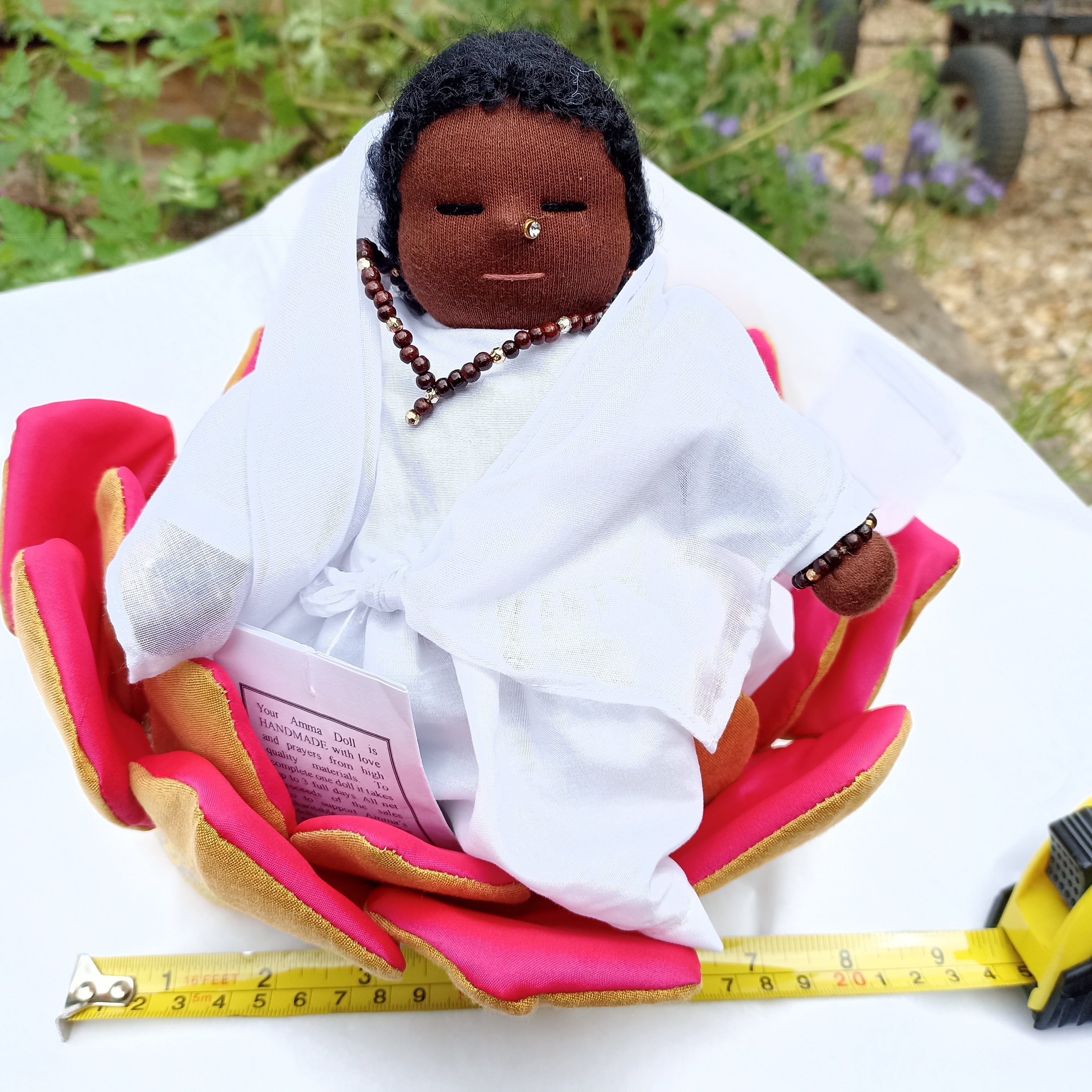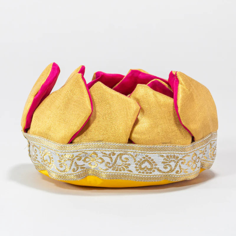 A divine pedestal for your beloved Amma doll or other sacred doll, with attached, radiant petals that stem from the golden cushion’s center, and delicate beaded trim. Each precious lotus peetham is designed to comfortably seat one of our Small, Medium or Large size dolls. Handmade with love and prayers. (Dolls sold separately.)