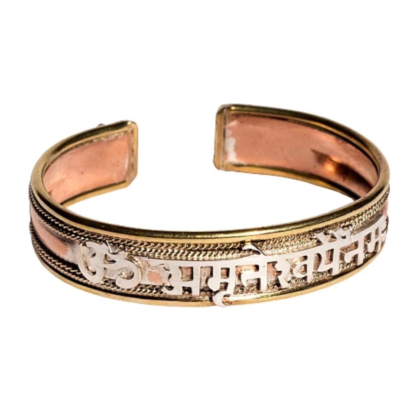 The inscription Om Amriteshwaryai Namah means "Salutations to the Immortal Goddess". When worn against the body it is reputed to be protective and beneficial on many levels, and according to the science of Ayurveda, the combination of metals brass, copper and silver in the bracelet purifies the body and the nervous system as well.
