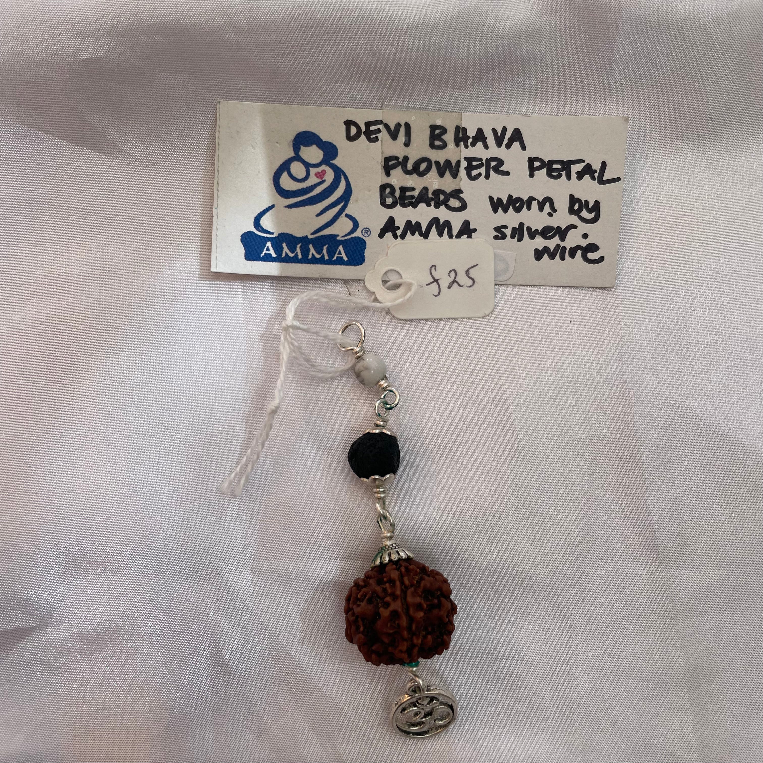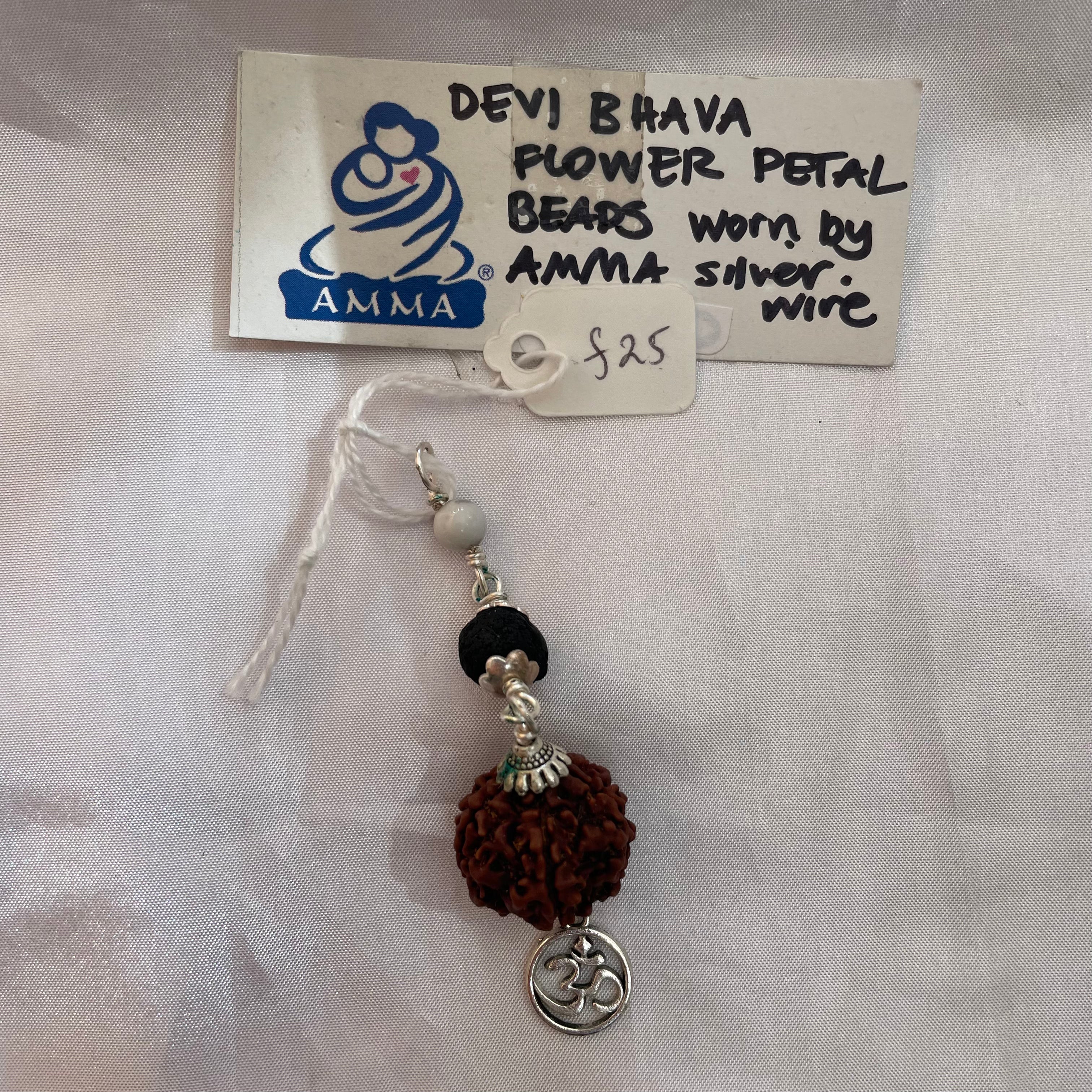 Pendant with rudraksha and devi bhava flower petal beads worn by Amma in silver wire